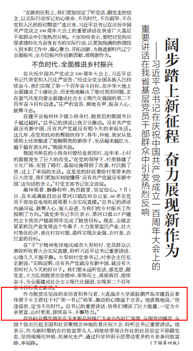 7月4日,《辽宁日报》头版以“阔步踏上新征程 奋力展现新作为——习近平总书记在庆祝中国共产党成立一百周年大会上的重要讲话在我省基层党员干部群众中引发热烈反响”为题,报道了公司派驻建昌县素珠营子乡王君杖子村第一书记杨军同志(WilliamHill中文官方网站)收看习近平总书记重要讲话的感想。