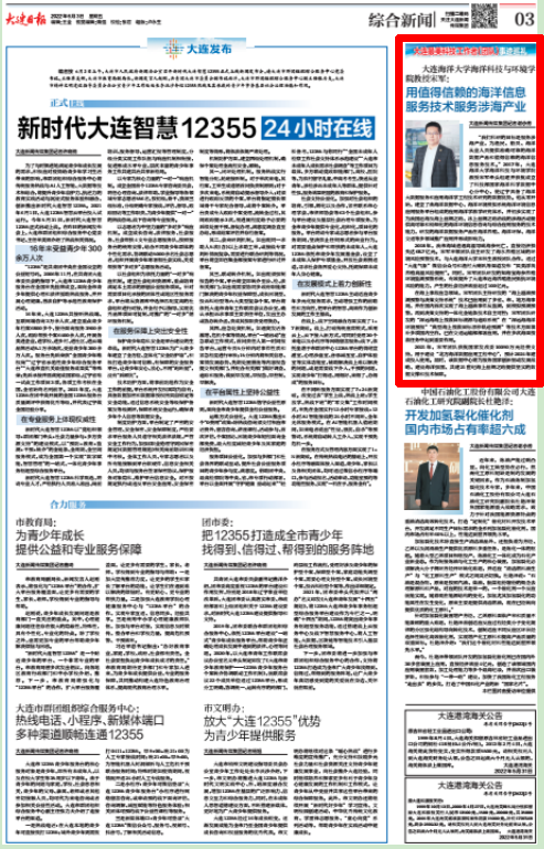 6月3日,大连日报在第A03版综合新闻中以《用值得信赖的海洋信息服务技术服务涉海产业》为题报道了“大连...